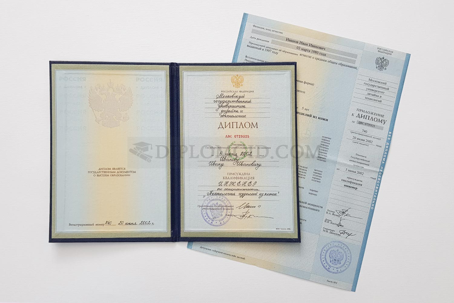 Диплом о высшем образовании 1997-2003 года. Комплект: диплом, приклеенный к обложке, приложение. Качество: Гознак